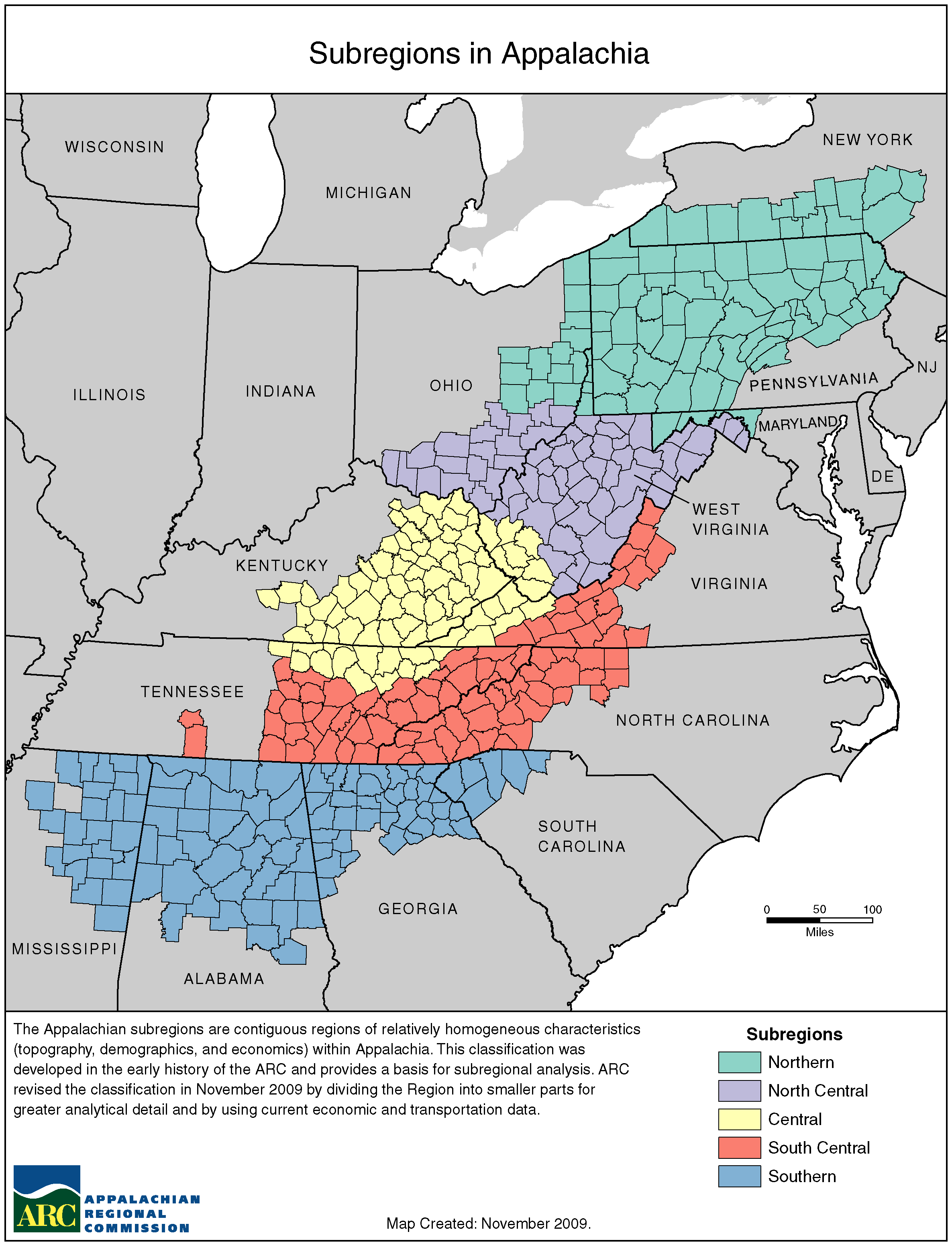 Map of Central Appalachia (Subregions highlighted in green, purple, red and yellow, and blue.) Appalachian Regional Commission (thestayproject.net)